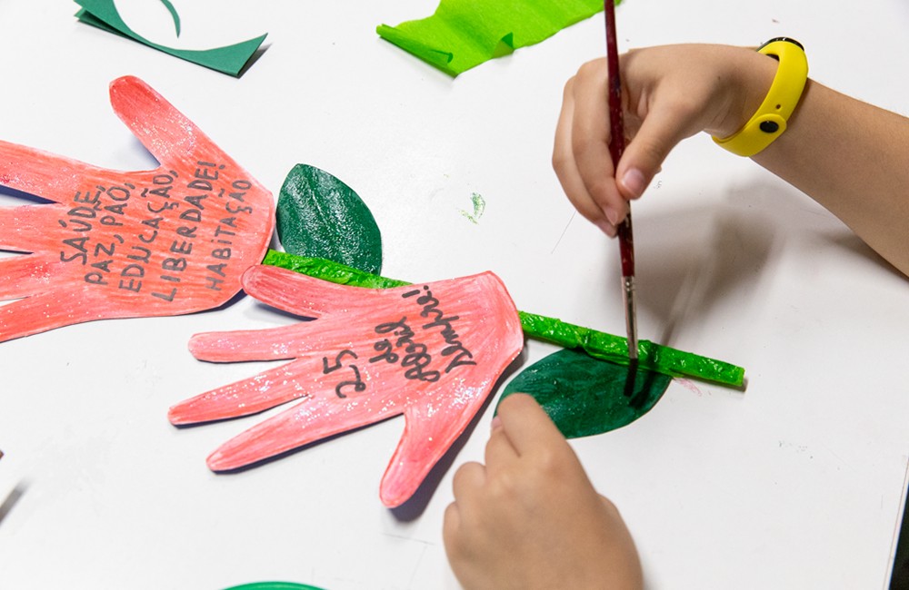 Ateliê de expressão plástica de elaboração de cravos a partir de diferentes materiais, em simultâneo com conversas sobre o 25 de Abril e as liberdades conquistadas.